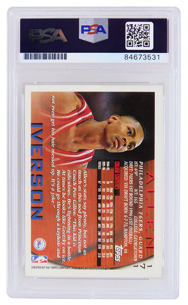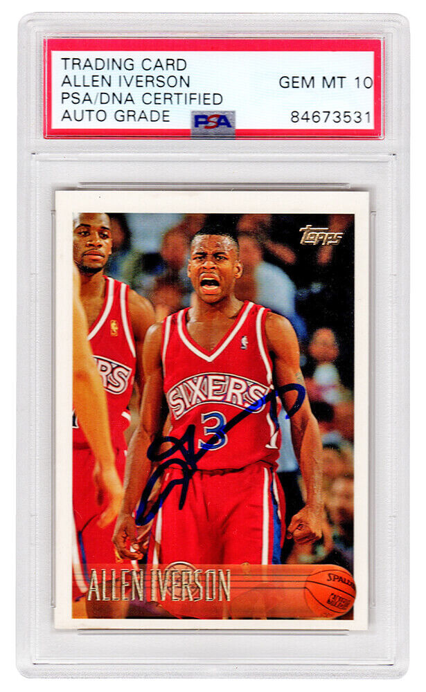 Allen Iverson signed Philadelphia 76ers 1996 Topps rookie basketball card #171. The card has been authenticated and encapsulated by PSA and the autograph has been given a GEM Mint 10 auto grade. The authentication number can be verified online. Only the autograph has been graded a 10 by PSA, the card itself is ungraded. The image of the item is a stock photo, as we may have multiples of the item in stock. The Slabbed Card you will receive will be of the card described. (Same grade, Same authentication) You may or may not receive the exact PSA serial number on the slab label shown in image.
