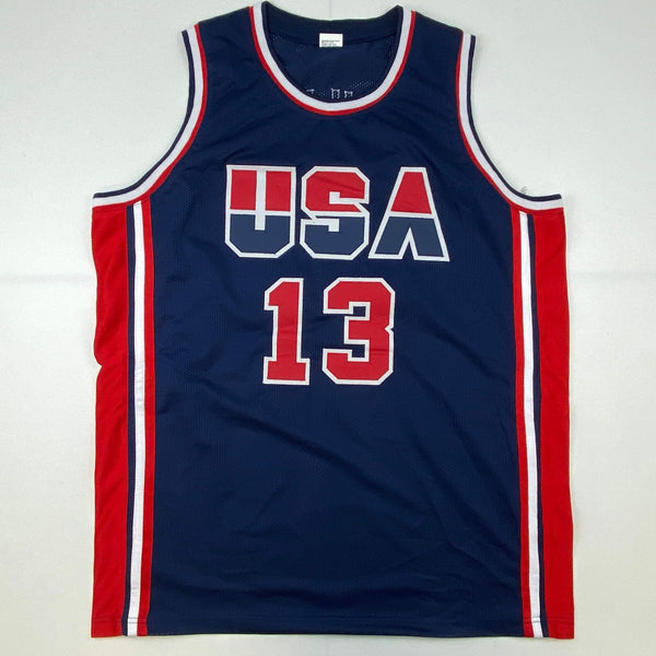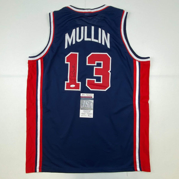 Autographed/Signed Chris Mullin 1992 Dream Team USA Olympics Blue Jersey JSA COA Jersey has no brand names or logos. This is a custom jersey and was not manufactured by or in any manner associated with any professional sports league or manufacturer. This custom jersey carries no professional sports league designation. The item is intended to be an autographed collectible. The custom jersey displays the name and number of the player. This item in no way is affiliated with or connected to any professional sports organization. Size is XL