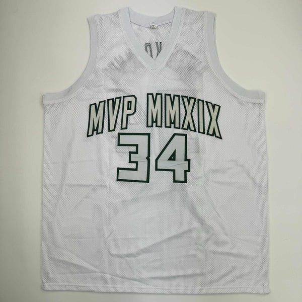 Autographed/Signed Giannis Antetokounmpo Milwaukee White Jersey JSA COA #2 Jersey has no brand names or logos. This is a custom jersey and was not manufactured by or in any manner associated with any professional sports league or manufacturer. This custom jersey carries no professional sports league designation. The item is intended to be an autographed collectible. The custom jersey displays the name and number of the player. This item in no way is affiliated with or connected to any professional sports organization. Size is XL.