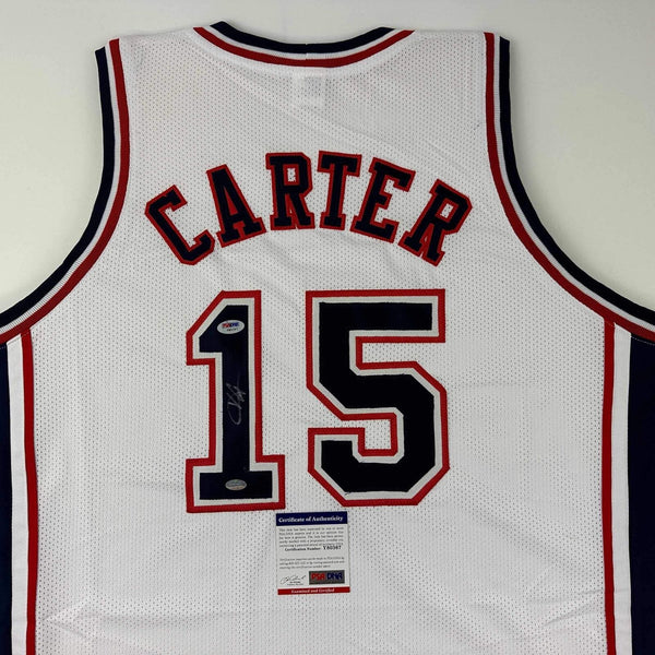 Autographed/Signed Vince Carter New Jersey White Basketball Jersey PSA/DNA COA Jersey has no brand names or logos. This is a custom jersey and was not manufactured by or in any manner associated with any professional sports league or manufacturer. This custom jersey carries no professional sports league designation. The item is intended to be an autographed collectible. The custom jersey displays the name and number of the player. This item in no way is affiliated with or connected to any professional sports organization. Size is XL.
