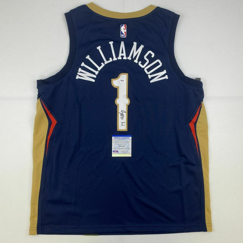 Autographed/Signed ZION WILLIAMSON New Orleans Blue Jersey PSA/DNA COA Auto This is a custom jersey and was not manufactured by or in any manner associated with any professional sports league or manufacturer. This custom jersey carries no professional sports league designation. The item is intended to be an autographed collectible. Reference of team in the title is to allow the purchaser a point of association. The custom jersey displays the name, number and authenticated signature of the player. This item in no way is affiliated with or connected to any professional sports organization. The autograph, as always is guaranteed to be authentic and has been certified as authentic by a third-party, trusted authenticator. Size is XL unless otherwise noted.