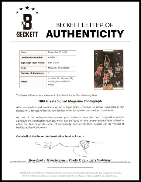 This is an 8x11 Magazine Page Photo that has been hand signed by Billy Cunningham, Earl Monroe & Elvin Hayes. There are creases in the item as shown. This item has been certified authentic by Beckett Authentication (BAS) and comes with their tamper-proof hologram and matching full-page certificate of authenticity.