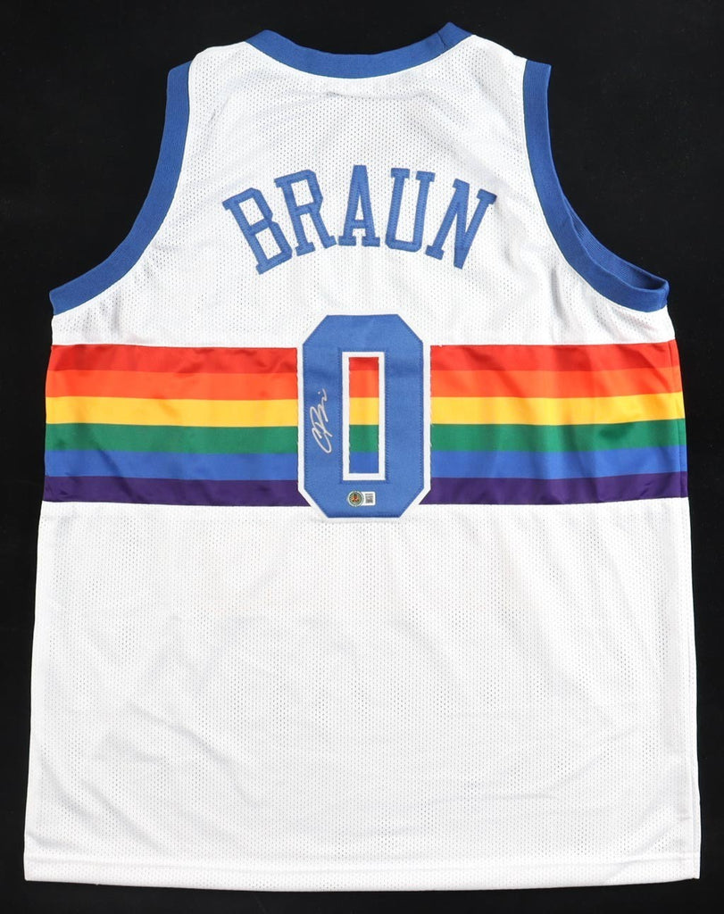 This autographed custom on-court style adult XL jersey has been personally hand-signed by Christian Braun of the Denver Nuggets.The autograph includes an official Beckett Authentication Services serially numbered scannable hologram and QR Code card for authenticity purposes. The signing of this item was witnessed by Beckett.Authentication: Beckett Scannable Hologram with QR Code cardCustom on-court style jerseys are a more affordable option for autograph seekers. These jerseys do not have any brand name or tags and are made in the Philippines. They feature stitched on names and numbers and are made to look very similar to the on-field jerseys that the players wear. These custom jerseys are very commonly used in the memorabilia industry.