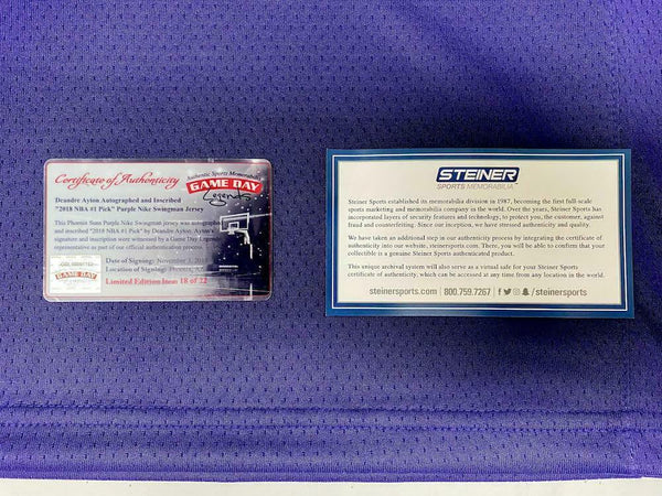 This jersey was autographed by Deandre Ayton with the inscription "2018 NBA #1 Pick." It is officially licensed by the National Basketball Association and comes with an individually numbered, tamper-evident hologram from Super Sports Center Authenticated as well as Steiner Sports Authentic. Your signed item can be identified and verified for authenticity by entering the serial number from your hologram into our online database. This process confirms and guarantees that your collectible is authentic and eliminates all possibility of duplication and fraud.This product is guaranteed authentic and includes a Super Sports Center Certificate of Authenticity and an accompanying tamper-evident hologram.