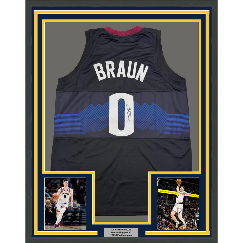 Framed Autographed/Signed Christian Braun 35x39 Denver Black 5280 Jersey JSA COA The item is professionally framed and matted with two 5x7 photos, measures 35x39 inches and is ready to be hung in your man cave! Photo and matting requests can be made.