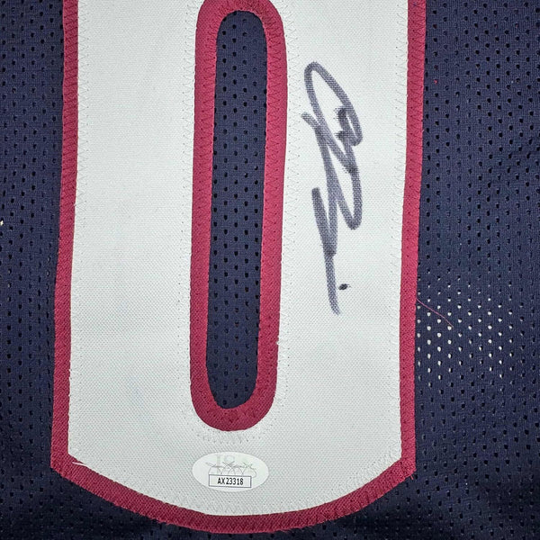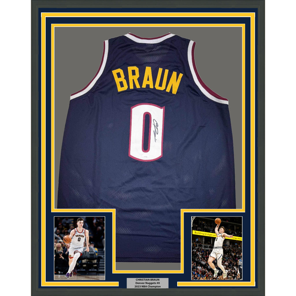 Framed Autographed/Signed Christian Braun 35x39 Denver Blue Jersey JSA COA The item is professionally framed and matted with two 5x7 photos, measures 35x39 inches and is ready to be hung in your man cave! Photo and matting requests can be made.