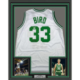 Framed Autographed/Signed Larry Bird 35x39 Boston White Jersey BAS COA The item is professionally framed and matted with two 5x7 photos, measures 35x39 inches and is ready to be hung in your man cave! Photo and matting requests can be made.