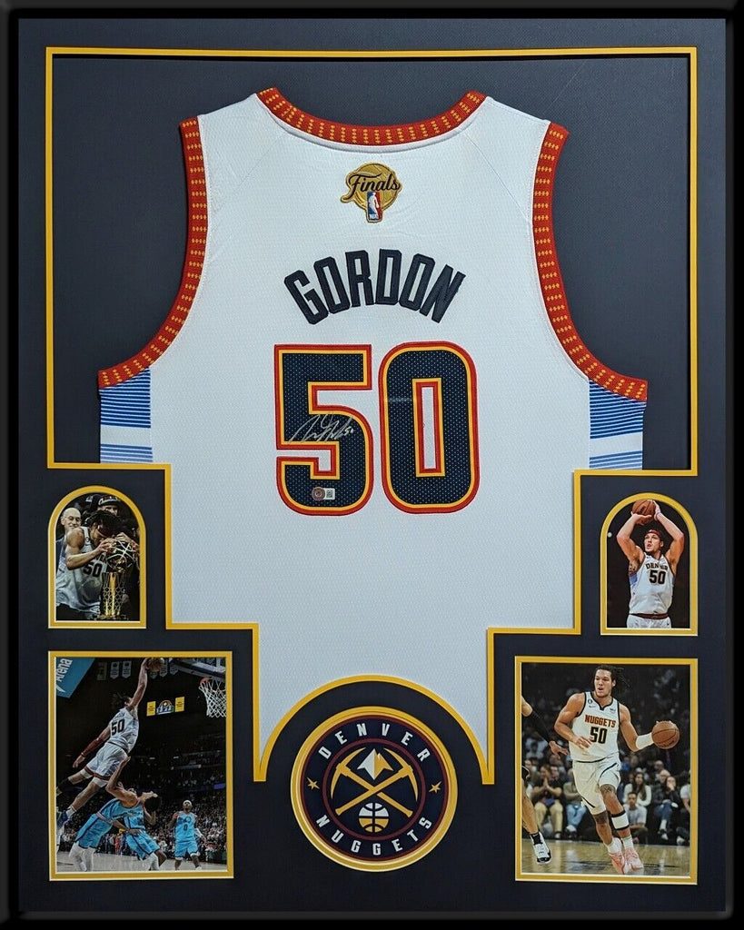 Custom Framed signed Aaron Gordon Denver Nuggets jersey. Beckett Hologram The authentication is from Beckett. This signature is authenticated by a representative of Beckett! 100% AUTHENTIC!!! The jersey has fully stitched numbers on the front and back. It is a great item and a must for all great sports fans! This item is professionally framed, it measures 32"x40" inside , 42"x34" outside , using UV protective Acrylic glass for safe keeping and safe transport, team color matting, black moulding and hanging hooks on the back. All additional items in frame seen in pictures included. 100% ready to hang in your fan cave.