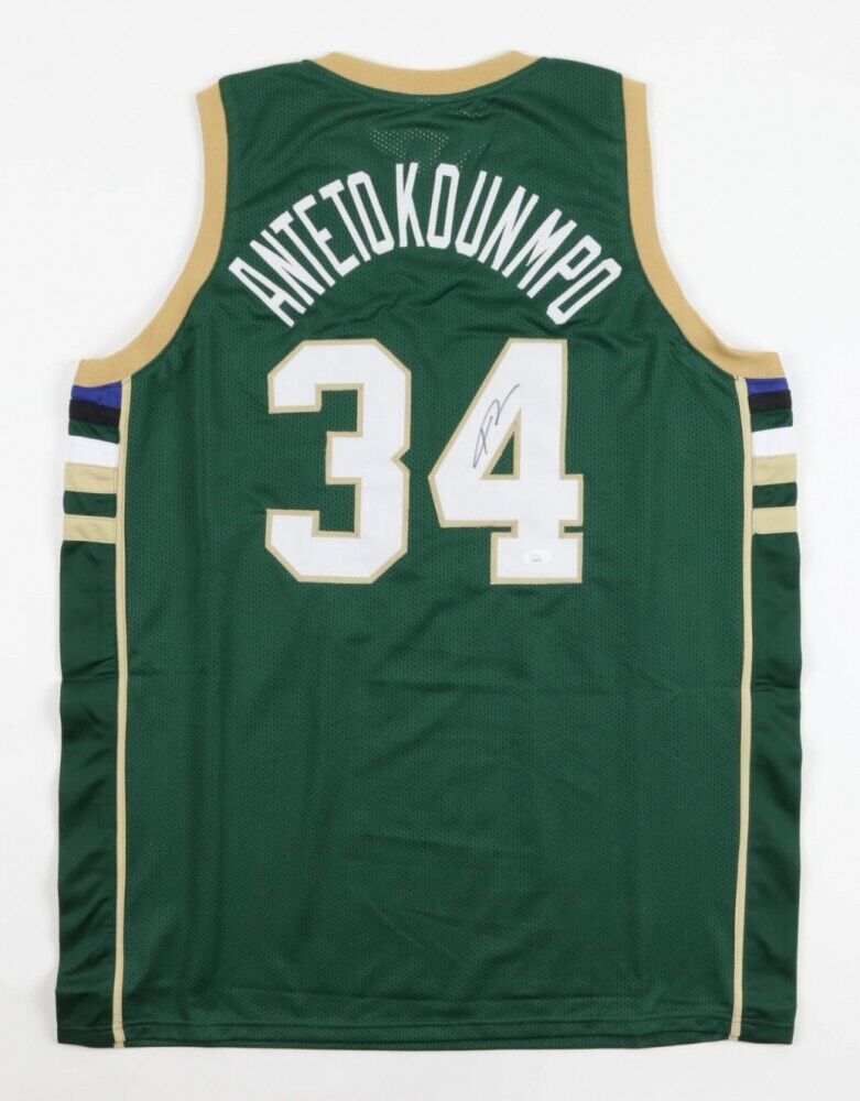 Custom on-court style jersey. Everything is sewn on, size XL. Jersey has been hand-signed in black felt-tip pen by Giannis Antetokounmpo. The lot / autograph(s) includes an official James Spence Authentication (JSA) hologram and QR Code card for authenticity purposes.Authentication: JSA QR Code card