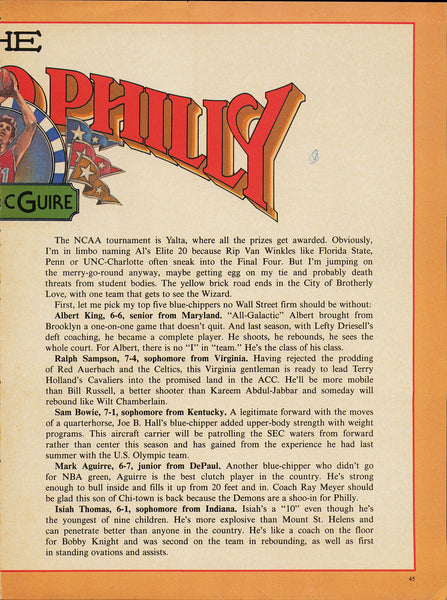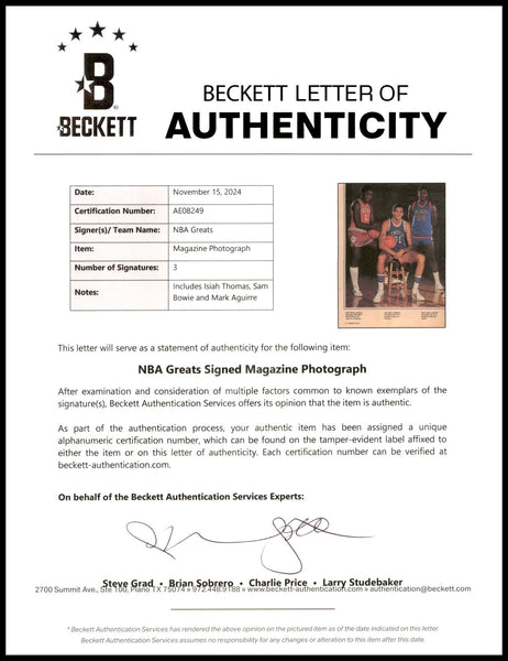 This is an 8x11 Magazine Page Photo that has been hand signed by Isiah Thomas, Sam Bowie & Mark Aguirre. There are creases in the item as shown. This item has been certified authentic by Beckett Authentication (BAS) and comes with their tamper-proof hologram and matching full-page certificate of authenticity.