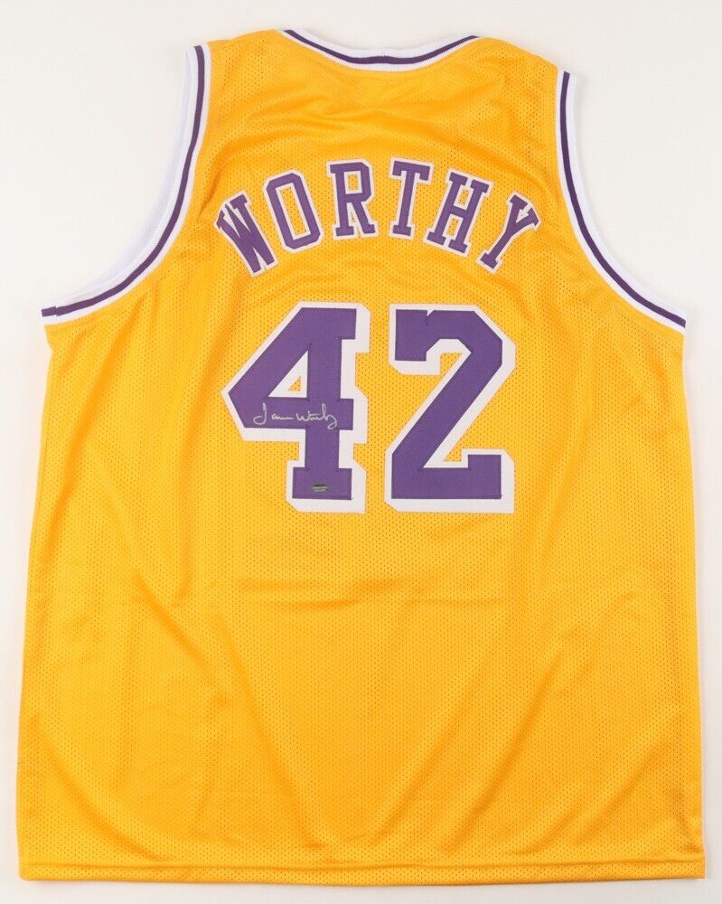 Custom on-field style jersey. Everything is sewn on, size XL. Has been hand-signed by James Worthy (HOF).The autograph(s) includes an official Schwartz Sports Hologram and matching COA for authenticity purposes.Authentication: Schwartz Sports COA