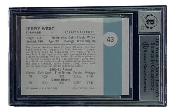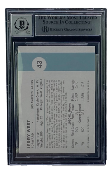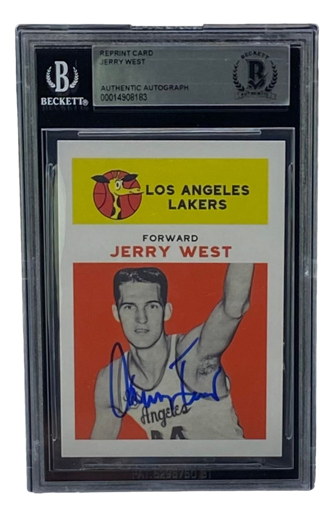 Featured is a Jerry West signed reprint 1961 Lakers Fleer rookie basketball card #43. This card has been slabbed and authenticated by Beckett. This card would make a great addition to any sports memorabilia collection!. SPECIFICATIONS Autographed By: Jerry West Team: Los Angeles Lakers Sport: Basketball Authentication: Beckett Grading Services