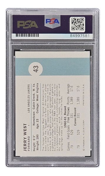Featured is a Jerry West signed reprint 1961 Los Angeles Lakers Fleer rookie basketball card #43. This card has been slabbed and authenticated by PSA authentication services giving the autograph a Gem Mint 10 grading. This card would make a great addition to any sports memorabilia collection!. SPECIFICATIONS Autographed By: Jerry West Team: Los Angeles Lakers Sport: Basketball Authentication: Professional Sports Authenticator (PSA)