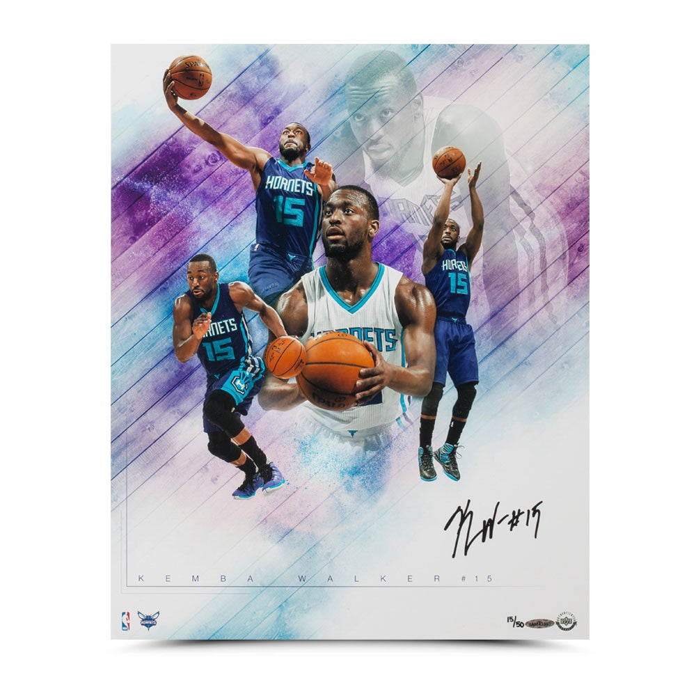 Hornets fans are learning that when the ball is in Kemba Walker's hands, good things are bound to happen. The consistency of his long-range jump shot has steadily increased to the point where he's guarded extremely tightly around the arc. A consistent deep shot has allowed him more freedom to take defenders one-on-one into the lane. His all-around offensive game lifted the Hornets to a 15-3 mark late in the 2015-16 season. In that stretch, the Bronx, New York, native averaged 24.7 points per game that included four consecutive 30-point efforts. He also notched a pair of double-doubles in that stretch with 10 assists in each game. Featuring five action images of Walker in Hornets home and away jerseys, this collage showcases the many things he does well with the ball in his hands. Walker has signed this Buzz Collage 16" x 20" image in black paint pen. His signature is deemed authentic by virtue of Upper Deck Authenticated's Five Step Process.