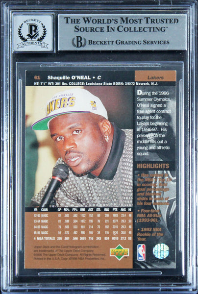 Lakers Shaquille O'Neal Signed 1996 Upper Deck #61 Card Auto 10! BAS Slabbed