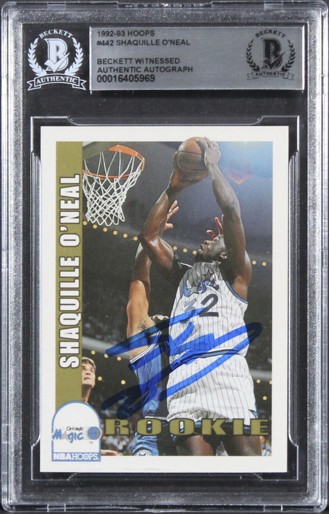 This Autographed 1992 Hoops #442 Rookie Card has been Personally Signed by Shaquille O'Neal of the Orlando Magic. This item is 100% Authentic, it comes slabbed and authenticated by Beckett Authentication Services. We conducted an autograph signing with Shaquille O'Neal where multiples of the same item were signed. While the photographs are representative of this item, the size, placement and strength of the signature may vary. Each item is hand signed, therefore, each autograph is unique. This item can be verified through BAS Slabbed.