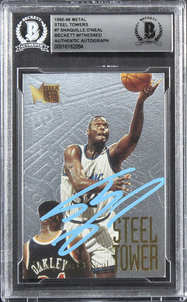 This Autographed 1995 Metal Steel Towers #7 Card has been Personally Signed by Shaquille O'Neal of the Orlando Magic. This item is 100% Authentic, it comes slabbed and authenticated by Beckett Authentication Services. We conducted an autograph signing with Shaquille O'Neal where multiples of the same item were signed. While the photographs are representative of this item, the size, placement and strength of the signature may vary. Each item is hand signed, therefore, each autograph is unique. This item can be verified through BAS Slabbed.