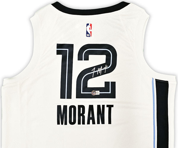 This is a White Nike Memphis Grizzlies Association Edition Swingman Jersey that has been hand signed by Ja Morant. This jersey is Size 48. This item has been certified authentic by Beckett Authentication (BAS) and comes with their tamper-proof QR Code sticker that can be verified on beckett-authentication.com.