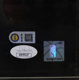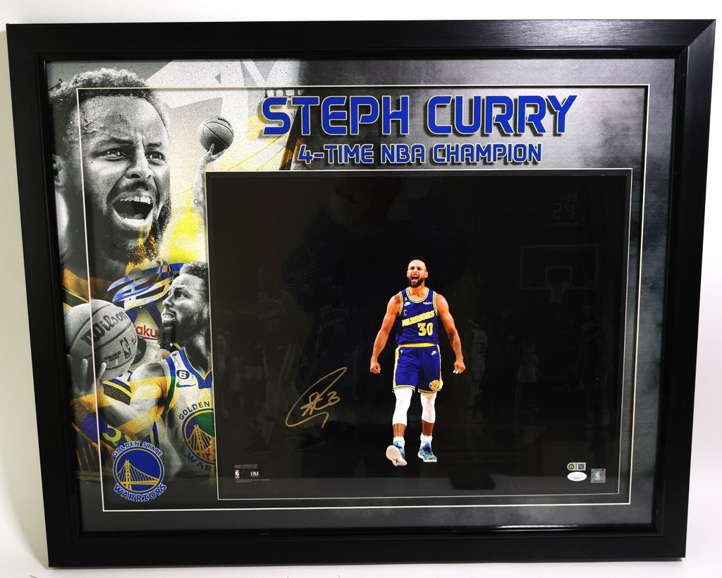 The product is a 16x20 photo of NBA champion Stephen Curry, autographed by the player himself. The autograph is authenticated by James Spence Authentication (JSA), adding value to the collectible item. This unique piece features a 3D frame that adds an extra dimension to the display, making it a standout piece for any basketball fan or collector of sports memorabilia. The photo captures Curry in his Golden State Warriors uniform, representing the team he led to multiple championships.