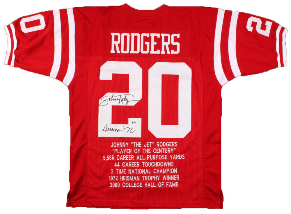 Johnny Rodgers, former Heisman Trophy winning running back for the Nebraska Cornhuskers, has hand signed this red custom stat jersey. Jersey is size XL and all letters/numbers are sewn-on. This item comes with a certificate of authenticity (COA) from Beckett Authentication Services and was signed in the presence of one of their representatives. You will receive a serial-numbered COA along with a matching serial-numbered sticker on the jersey. The authenticity can be verified online by entering the serial number.Item pictured may not be the exact item you will receive. It will be similar quality, and we guarantee your satisfaction.