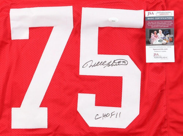Custom on-field style jersey. Everything is sewn on, size XL. Hand-signed by Will Shields (HOF). Please note, glue is visible through the front and reverse numbers as well as a stain on the right sleeve. See photos for the condition of the item.The autograph(s) includes an official James Spence Authentication (JSA) hologram and matching COA for authenticity purposes.Authentication: JSA COA