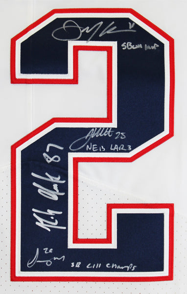 This Autographed Limited Edition #23/53 White Nike Elite Jersey with the inscription of "NE 13 - LAR 3 (White), SB 53 GW INT (Gilmore), SBLIII Champs (Michel), SB 53 MVP (Edelman)" has been Personally Signed by Tom Brady, Rob Gronkowski, Stephon Gilmore, Julian Edelman, James White & Sony Michel of the New England Patriots. This item is 100% Authentic to include a hologram by Beckett Authentication Services. This item will come with an affixed Beckett Authentication Services (BAS) authentication sticker, which includes a scannable QR code to verify authenticity. Please note that Beckett no longer provides serial-numbered COA cards, and the attached BAS sticker will serve as the complete authentication for this item. The authenticity can be verified on Beckett Authentication Services website. This is a XX-Large sized Jersey.