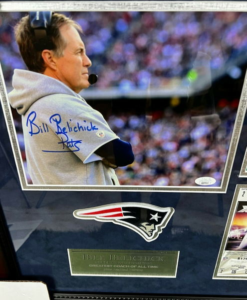 This cut custom framed to 21x127 has been personally hand-signed by Bill Belichick100% Authentic. Certificate of Authenticity by JSA