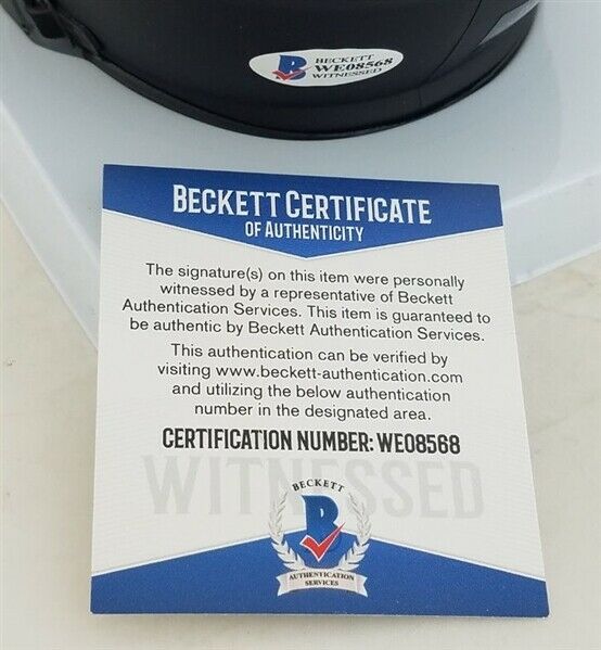 This autographed Riddell Eclipse Alternate mini helmet has been personally hand-signed by Chase Winovich of the New England Patriots. This autograph is certified by Beckett Authentication Services (BAS) Witness Certification. That means that a Beckett representative was present when this item was signed. It comes with the numbered authentication hologram and matching Certificate of Authenticity.