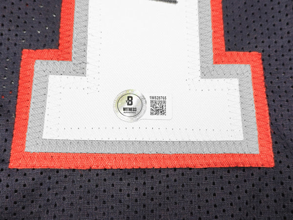 This is a Blue Jersey that has been hand signed by Drew Bledsoe. This is a custom jersey with no name brand. The approximate size is XL. It has nice sewn in name and numbers. This item has been witnessed and certified authentic by Beckett Authentication (BAS) and comes with their tamper-proof witness sticker.