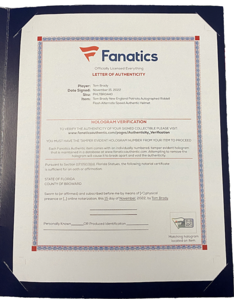 This new england patriots flash authentic speed helmet has been personally hand-signed by tom brady. it is officially licensed by the national football league and comes with an individually numbered, tamper-evident hologram from fanatics authentic. to ensure authenticity, the hologram can be reviewed online. this process helps to ensure that the product purchased is authentic and eliminates any possibility of duplication or fraud.