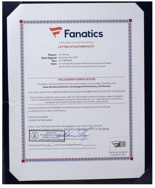This authentic Salute To Service (STS) Speed helmet has been personally hand-signed by Tom Brady. It is officially licensed by the National Football League and comes with an individually numbered, tamper-evident hologram from Fanatics Authentic. To ensure authenticity, the hologram can be reviewed online. This process helps to ensure that the product purchased is authentic and eliminates any possibility of duplication or fraud.