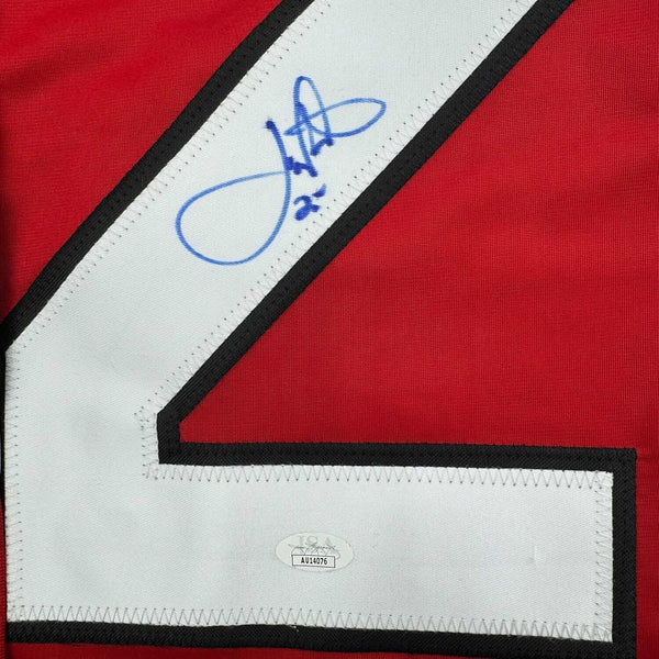 Framed Autographed/Signed Joe Nieuwendyk 35x39 New Jersey Red Jersey JSA COA The item is professionally framed and matted with two 5x7 photos, measures 35x39 inches and is ready to be hung in your man cave! Photo and matting requests can be made.