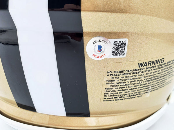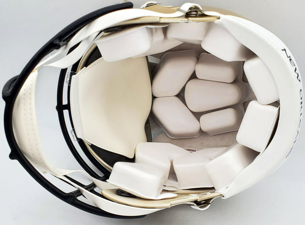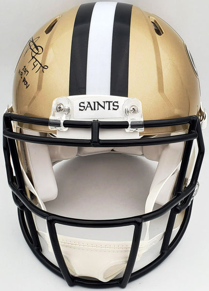 This is a New Orleans Saints Gold Full Size Authentic Speed Helmet that has been hand signed by Alvin Kamara. This item was inscribed "2017 NFL ROY." This item has been certified authentic by Beckett Authentication (BAS) and comes with their tamper-proof QR Code sticker that can be verified on the Beckett-authentication.com.