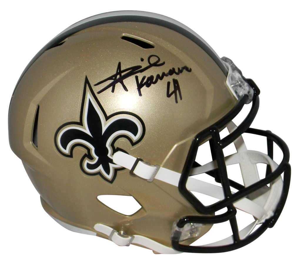 Alvin Kamara, All-Pro running back for the New Orleans Saints, has hand signed this Saints Riddell Speed full-size replica helmet at a private signing. This item comes with a certificate of authenticity (COA) from Beckett Authentication Services and was signed in the presence of one of their representatives. You will receive a serial-numbered COA along with a matching serial-numbered sticker on the helmet. The authenticity can be verified online by entering the serial number.Item pictured may not be the exact item you will receive. It will be similar quality, and we guarantee your satisfaction.