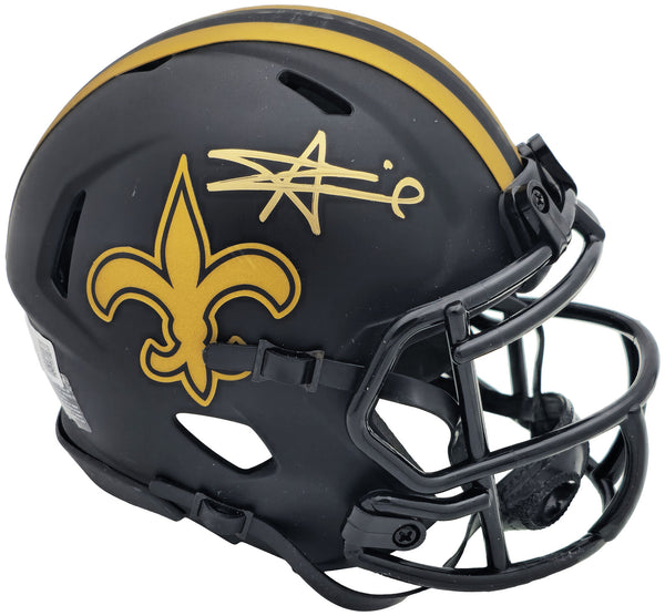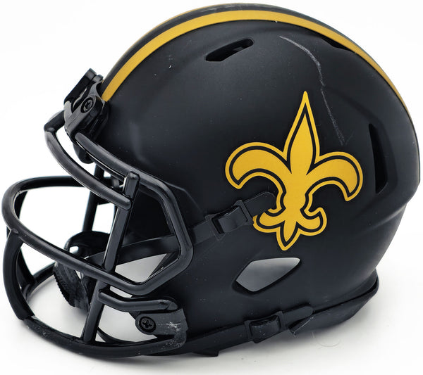 This is a New Orleans Saints Eclipse Black Speed Mini Helmet that has been hand signed by Alvin Kamara. The Eclipse helmets are delicate and may have some marks or scratches on them. This item has been witnessed and certified authentic by Beckett Authentication (BAS) and comes with their tamper-proof witness sticker.