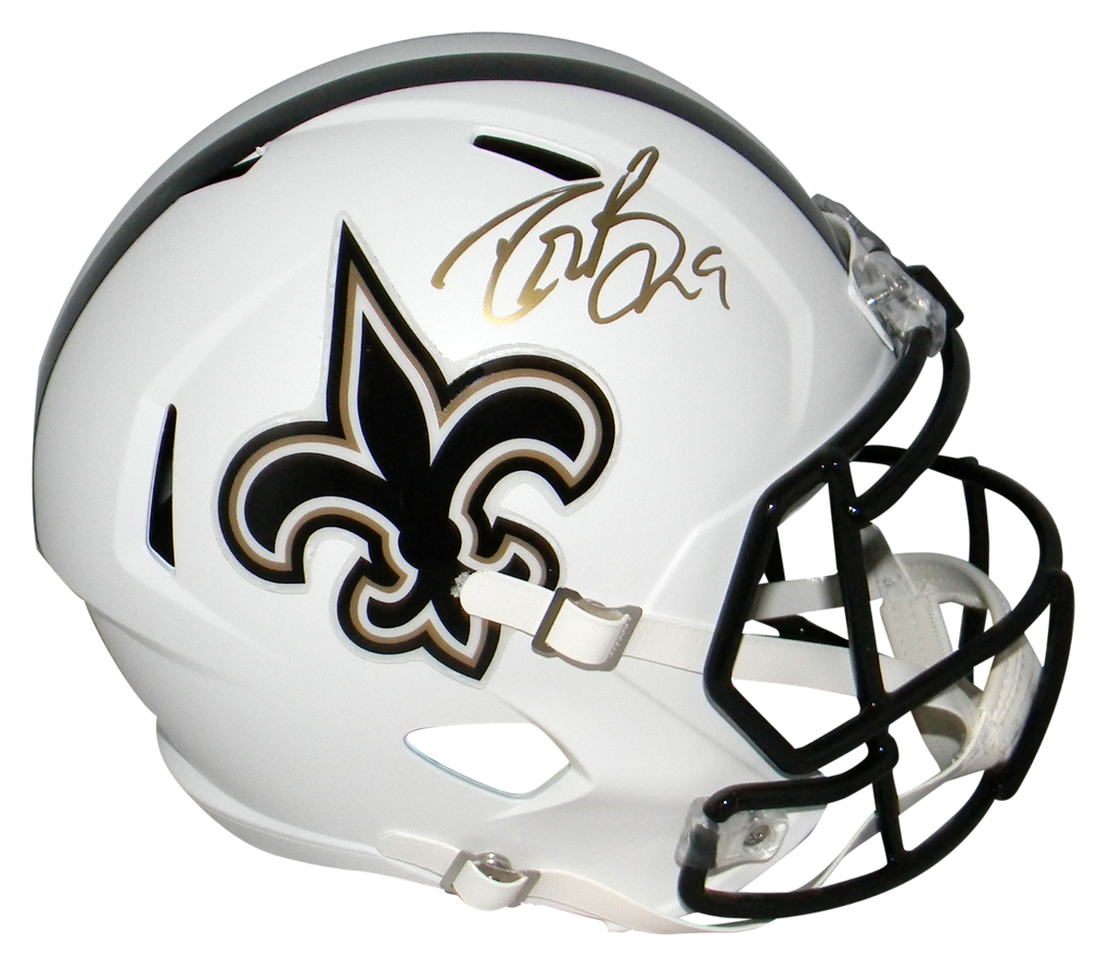 Drew Brees, former All-Pro quarterback for the New Orleans Saints, has hand signed this New Orleans Saints Riddell Speed Flat White full-size replica helmet at a private signing. This item comes with a certificate of authenticity (COA) from Beckett Authentication Services and was signed in the presence of one of their representatives. You will receive a serial-numbered COA along with a matching serial-numbered sticker on the helmet. The authenticity can be verified online by entering the serial number.Item pictured may not be the exact item you will receive. It will be similar quality, and we guarantee your satisfaction.