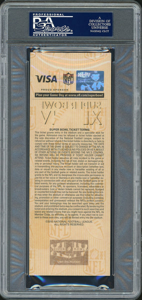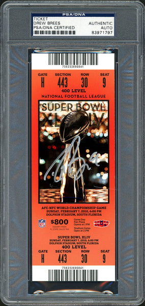 This is a Super Bowl XLIV Ticket that has been hand signed by Drew Brees. It has been certified authentic by PSA/DNA and comes encapsulated in their tamper-proof holder.