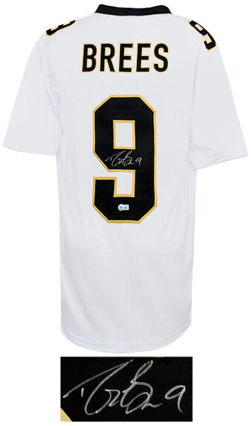 Drew Brees signed white custom football jersey. Item comes with a Beckett Authentication tamper evident numbered sticker and matching Certificate of Authenticity which can be verified online. Jersey is size XL.