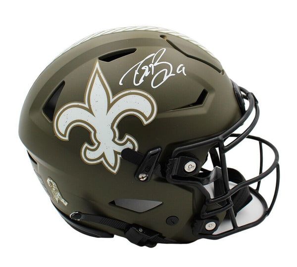A New Orleans Saints Speed Flex Authentic Salute to Service NFL Helmet hand signed by Drew Brees. The item and signature are in excellent condition. Drew is an 11x Pro Bowler, Super Bowl Champion, Super Bowl MVP, and 2x NFL Offensive Player of the Year. AUTHENTICATION: The item is tagged with a SmarTag powered by Prova Technology which gives you digital access to the items authentication records including a prof picture from the sign.