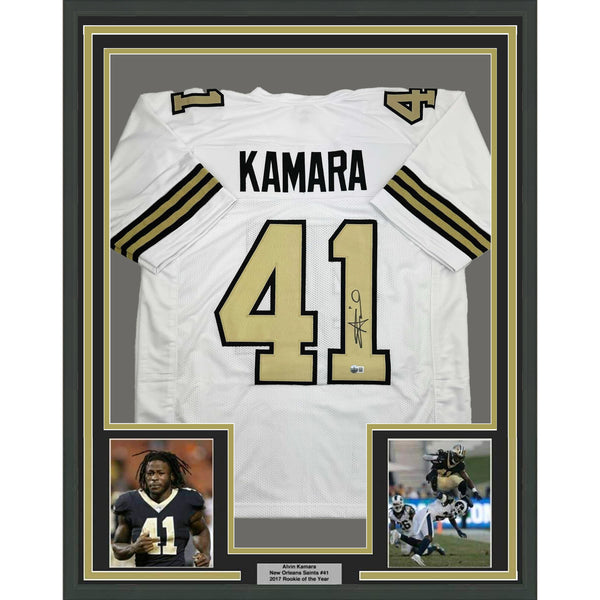 Framed Autographed/Signed Alvin Kamara 35x39 New Orleans CR Jersey Beckett COA The item is professionally framed and matted with two 5x7 photos, measures 35x39 inches and is ready to be hung in your man cave! Photo and matting requests can be made.