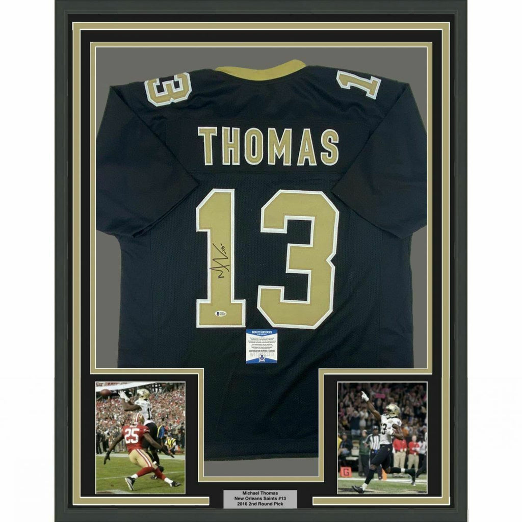 FRAMED Autographed/Signed MICHAEL THOMAS 33x42 New Orleans Black Jersey BAS COA The item is professionally framed & matted with two 8x10 photos, measures 33"x42" and is ready to be hung in your man cave! NOTE: COA card will be mounted on the back of the frame, not inside it on top of the jersey as seen in the picture.