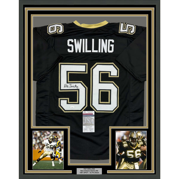 Framed Autographed/Signed Pat Swilling 35x39 New Orleans Black Jersey JSA COA The item is professionally framed and matted with two 5x7 photos, measures 35x39 inches and is ready to be hung in your man cave! Photo and matting requests can be made.