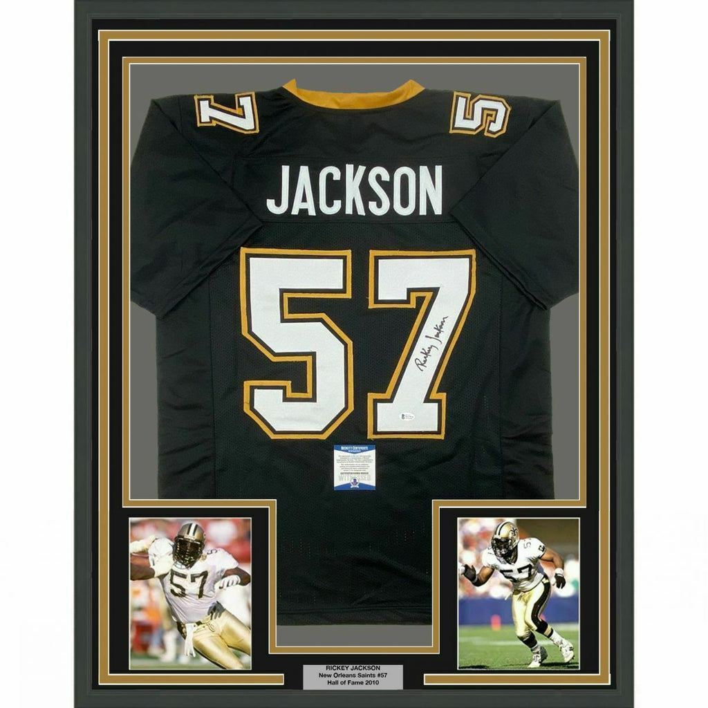 FRAMED Autographed/Signed RICKEY JACKSON 33x42 New Orleans Black Jersey BAS COA The item is professionally framed & matted with two 8x10 photos, measures 33"x42" and is ready to be hung in your man cave! NOTE: COA card will be mounted on the back of the frame, not inside it on top of the jersey as seen in the picture.