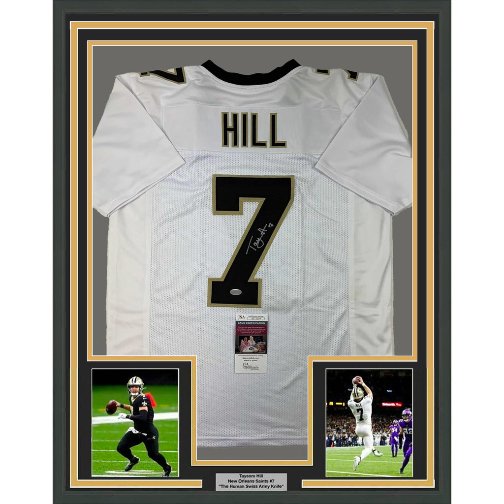 Framed Autographed/Signed Taysom Hill 33x42 New Orleans White Jersey JSA COA The item is professionally framed and matted with two 5x7 photos, measures 35x39 inches and is ready to be hung in your man cave! Photo and matting requests can be made.
