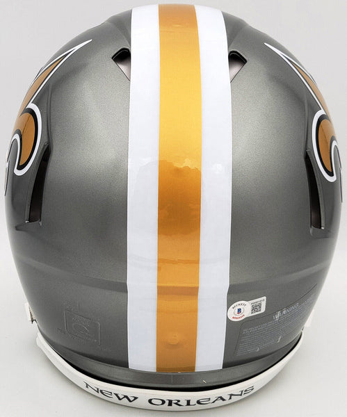 This is a New Orleans Saints Flash Gray Full Size Authentic Speed Helmet that has been hand signed by Jameis Winston. The Flash helmets are very delicate and often have some marks or scratches on them. This item has been certified authentic by Beckett Authentication (BAS) and comes with their tamper-proof QR Code sticker that can be verified on the Beckett-authentication.com.