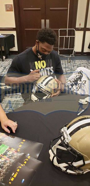 A New Orleans Saints Speed Authentic NFL Helmet hand signed by Jared Cook. The item and signature are in excellent condition. Jared is an NFL Tight End for the New Orleans Saints. He played college football at the University of South Carolina and was drafted by the Tennessee Titans in the third round of the 2009 NFL Draft. He has also played for the St. Louis Rams, Green Bay Packers, and Oakland Raiders. AUTHENTICATION: The item is accompanied by a JSA Certificate of Authenticity - JSA Serial Numbered and Databased Hologram - Picture of Jared from the Signing
