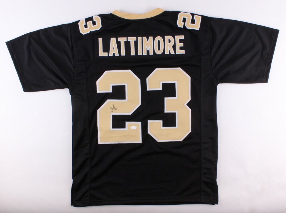 Custom on-field style jersey. Everything is sewn on, size XL. Hand-signed in black felt-tip pen by Marshon Lattimore. The lot / autograph(s) includes an official James Spence Authentication (JSA) hologram and matching COA for authenticity purposes. The signing of this item was witnessed by JSA.Authentication: JSA COA