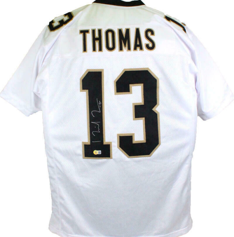 THIS IS NOT AN NFL JERSEY. THIS HAS NO TAGS, NO LOGOS, NO EMBLEMS. This is a Michael Thomas of the New Orleans Saints hand autographed custom made (Non Name Brand) authentic style (Stitched Letters and Numbers) jersey. This item has a Beckett Witnessed Authentication, which comes with a numbered hologram. It was signed either at a public autograph appearance or a private signing. This is a stock photo of the item. Although you may not receive this exact item, the item you receive is virtually identical,brand new, and in great shape. Jersey size is XL. THIS IS NOT AN NFL JERSEY. THIS HAS NO TAGS, NO LOGOS, NO EMBLEMS. This is a Michael Thomas of the New Orleans Saints hand autographed custom made (Non Name Brand) authentic style (Stitched Letters and Numbers) jersey. This item has a Beckett Witnessed Authentication, which comes with a numbered hologram. It was signed either at a public autograph appearance or a private signing. This is a stock photo of the item. Although you may not receive this exact item, the item you receive is virtually identical,brand new, and in great shape. Jersey size is XL.