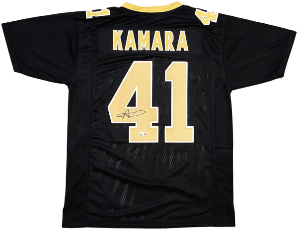 This is a Black Jersey that has been hand signed by Alvin Kamara. This is a custom jersey with no name brand. The approximate size is XL. It has nice sewn in name and numbers. This item has been witnessed and certified authentic by Beckett Authentication (BAS) and comes with their tamper-proof witness hologram.