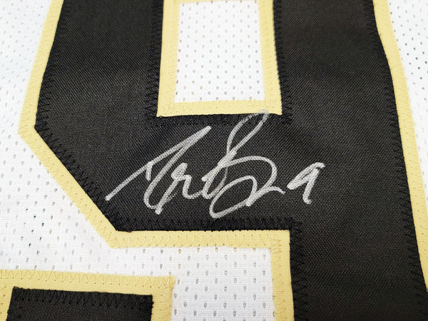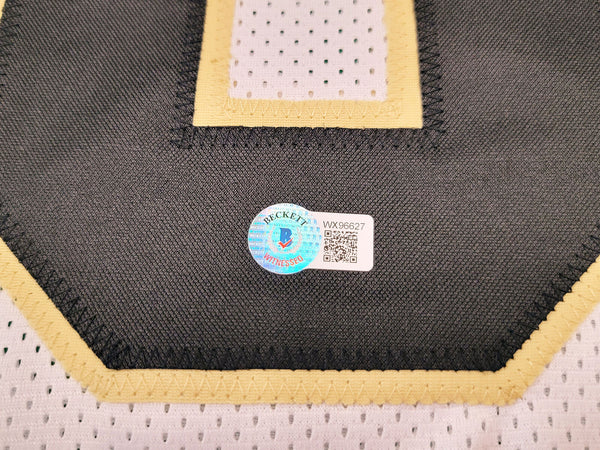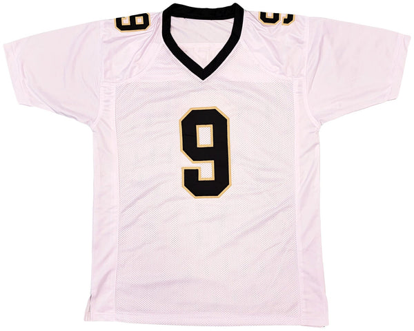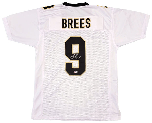 This is a White Jersey that has been hand signed by Drew Brees. This is a custom jersey with no name brand. The approximate size is XL. It has nice sewn in name and numbers. This item has been witnessed and certified authentic by Beckett Authentication (BAS) and comes with their tamper-proof witness sticker. Beckett Authentication has recently changed their physical certificate card policy where they no longer match their tamper-proof sticker with a physical certificate. A certificate can be printed on Beckett's website for the matching authentication number.